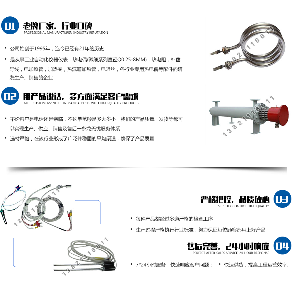 天津昊泰電熱元器件有限公司始創于1995年,迄今已經有18年的歷史,是專業從事工業自動化儀器儀表,熱電偶(微細系列直徑Q0.25-8mm),熱電阻,補償導線,電加熱管,加熱圈,熱流道加熱管,電阻絲,各行業專用熱電偶等配件的研發、生產、銷售的標桿企業。 我們的產品以“昊泰”為主品牌,可以廣泛用于玻璃、冶金、鋼鐵、石化、水泥,電力,塑料,食品等行業。產品從選材開始就非常的嚴格,18年的從業經驗,我們已經在該行業形成了廣泛并穩固的優質采購渠道,確保了產品質量關。同時,引進的國外先進的生產及檢驗設備,以及擁有的業界資深的技術研發團隊,使得生產流程能夠規范的按照ISO9001:2000國際質量體系標準進行,能夠在技藝上精益求精。 天津江蘇商會五金機電分會副會長,昊泰總經理李興旺,一直秉信先做人,再做朋友,再做生意。不論客戶是電話還是親臨,不論單筆額是多大多小,我們的產品質量、價格、發貨等都可以實現生產、供應、銷售及售...
